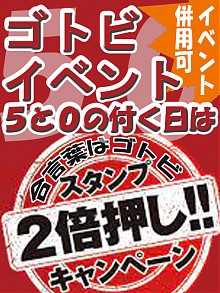 ☆★ゴトビイベント★☆ 『0』、『5』が付く日・・・いわゆる五・十日は 受付で合言葉 『ゴトビ』っで・・・ スタンプ2倍押し!! ※各種イベントと併用可能です!!