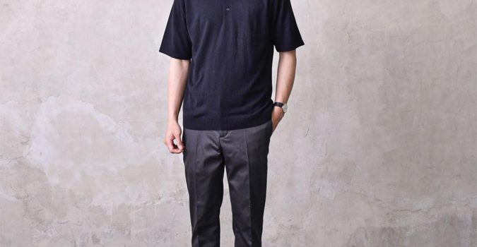 来る人来る人半袖ネイビーのポロシャツにチノパン