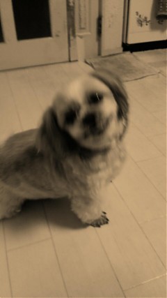 アラレのふところ辺りに…子猫が甘えてぴったりとついています♪