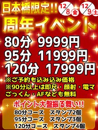 おはようございます本日 12月 14日 日曜日周年祭2日目です!!!!朝から晩までかなり奥様も料金も激アツになりそうです!!料金はもちろんのこと激安なのですが特典がかなりすんげーーーです!!日本橋にまだご来店いただいたこ...